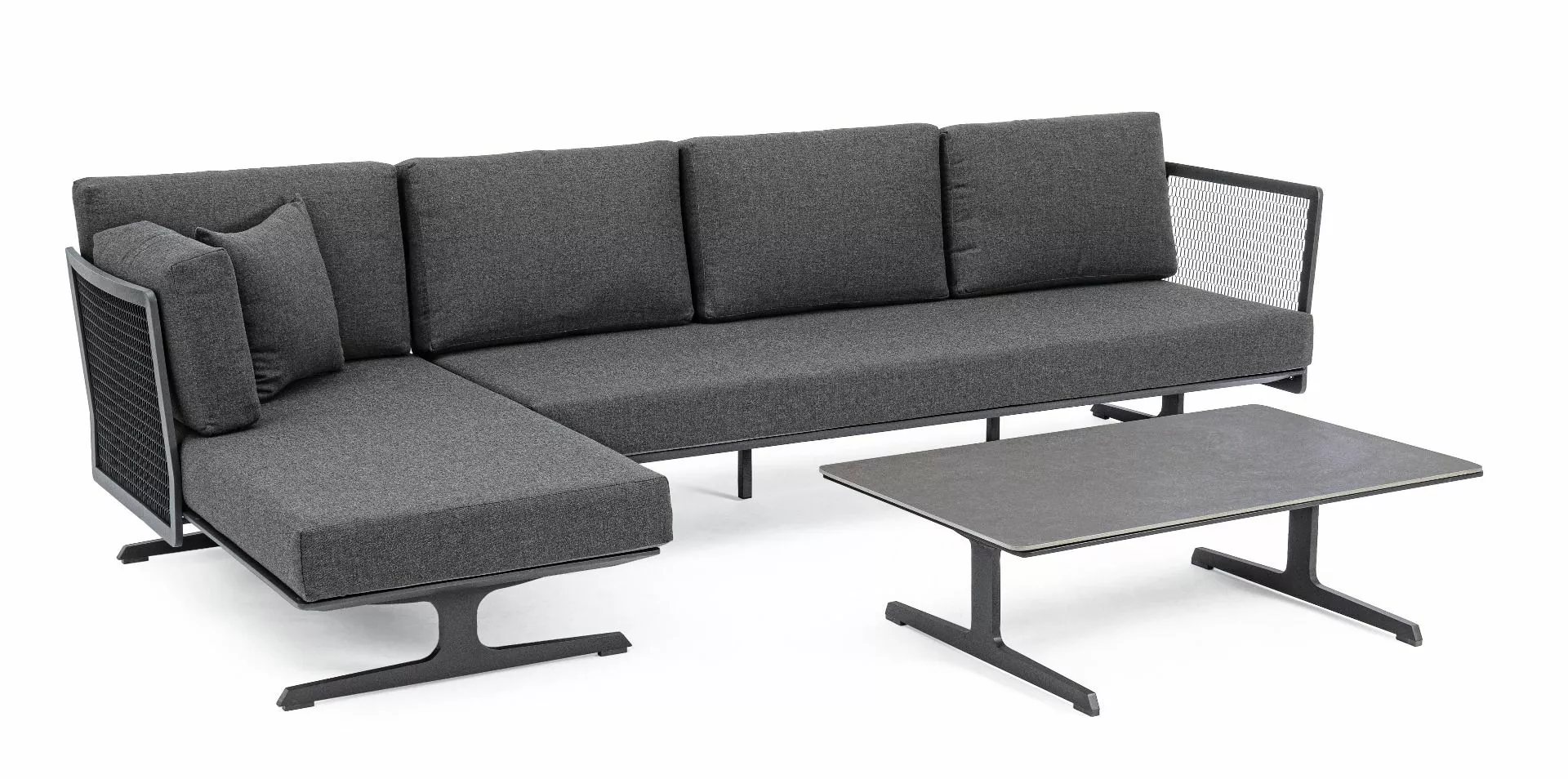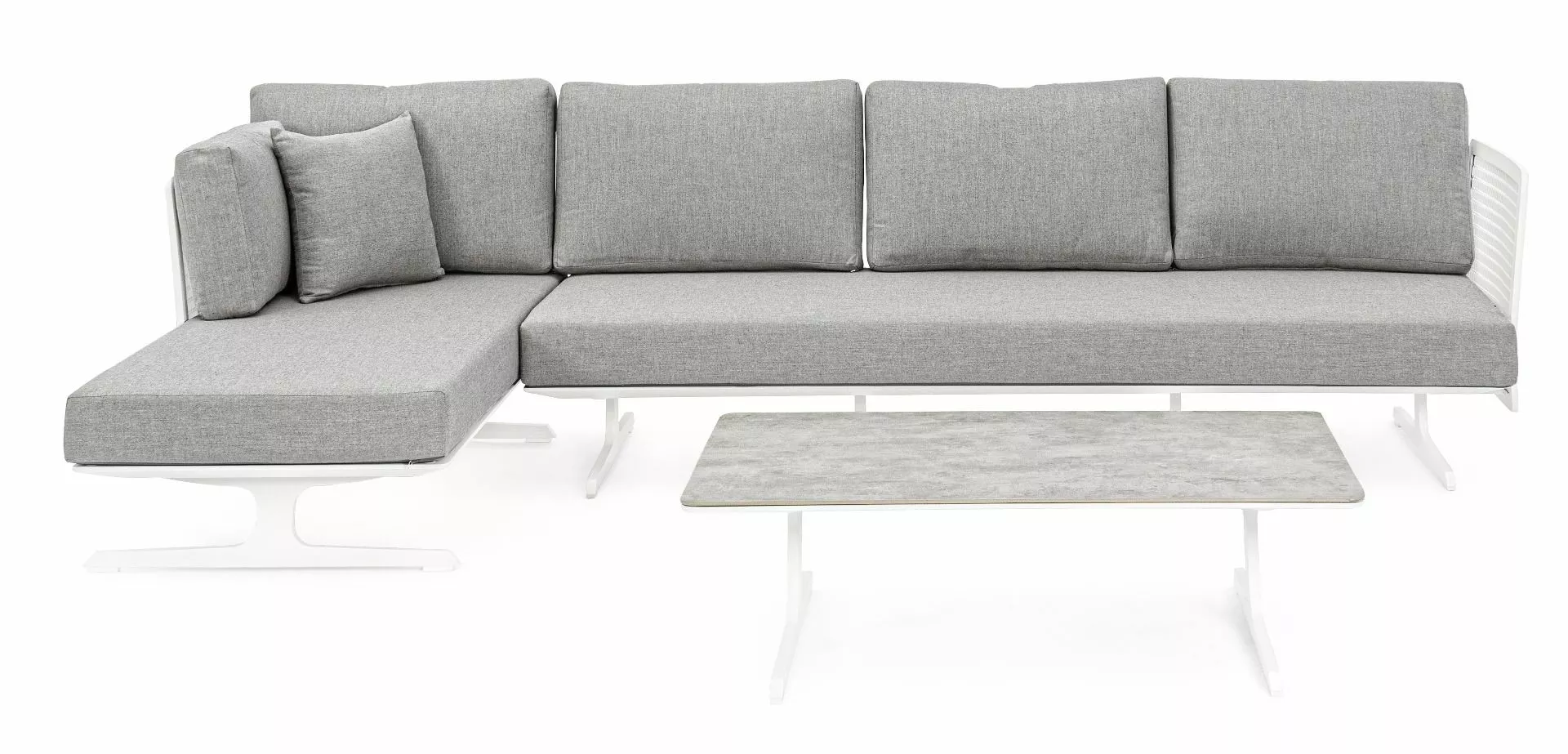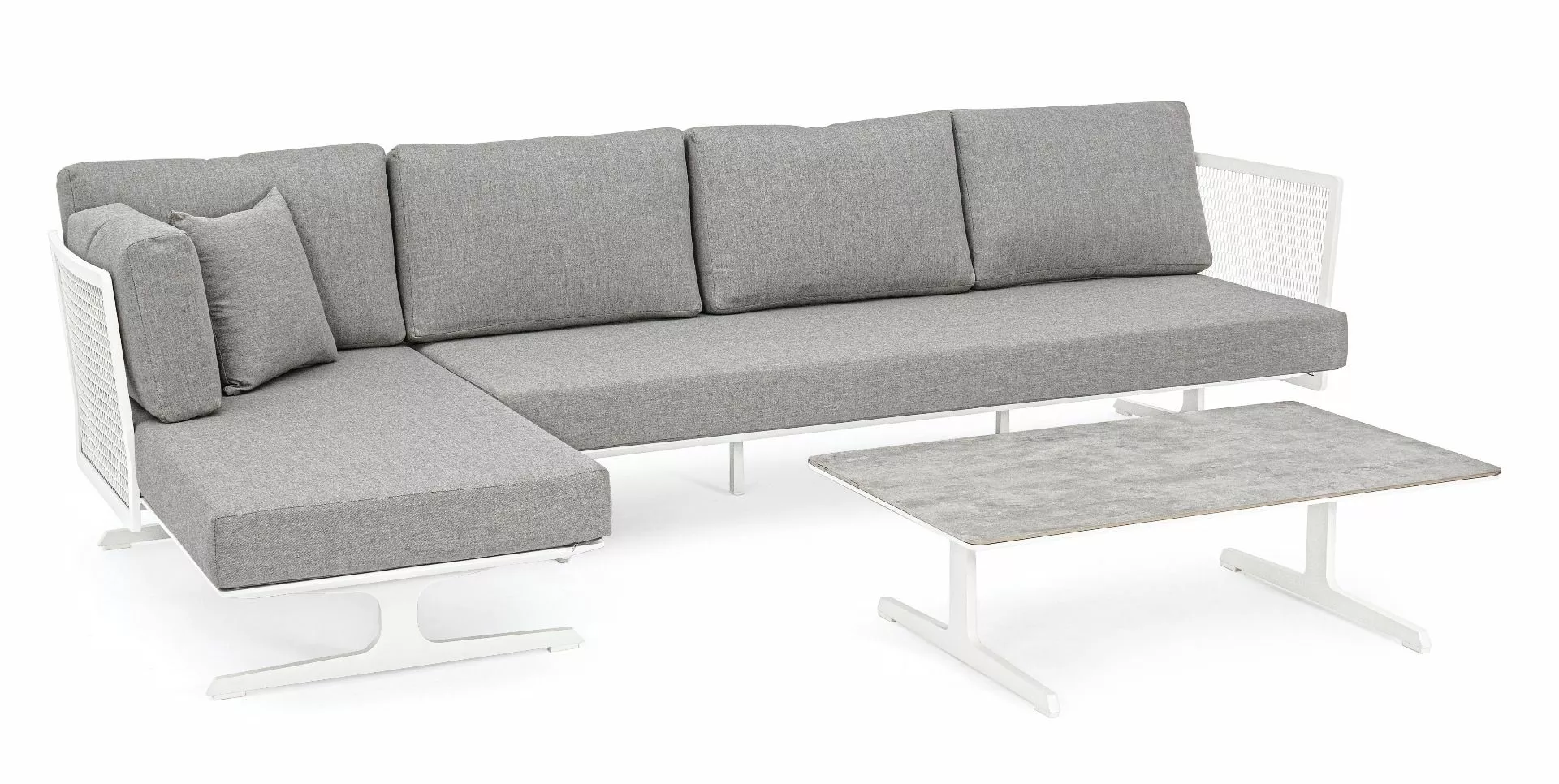 Pulverlakkert (polyester) aluminium. sete- og ryggputer med avtakbart trekk i akrylstoff. salongbord med keramisk topp. skruer i rustfritt stål. rygglener som skal monteres.