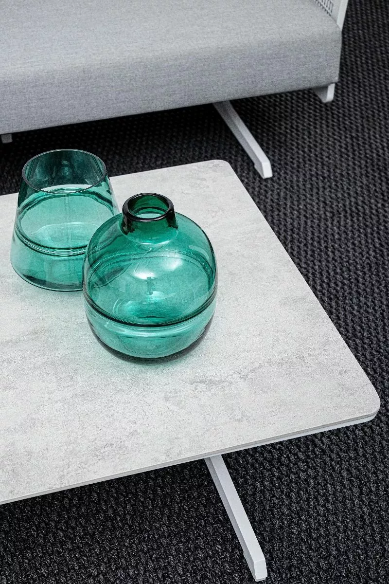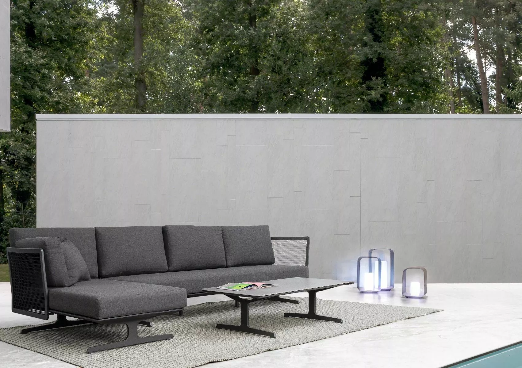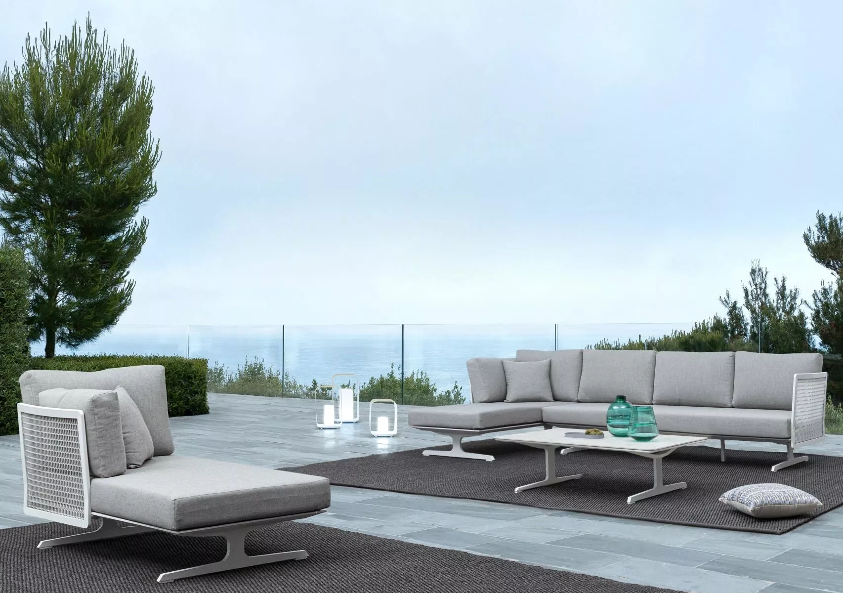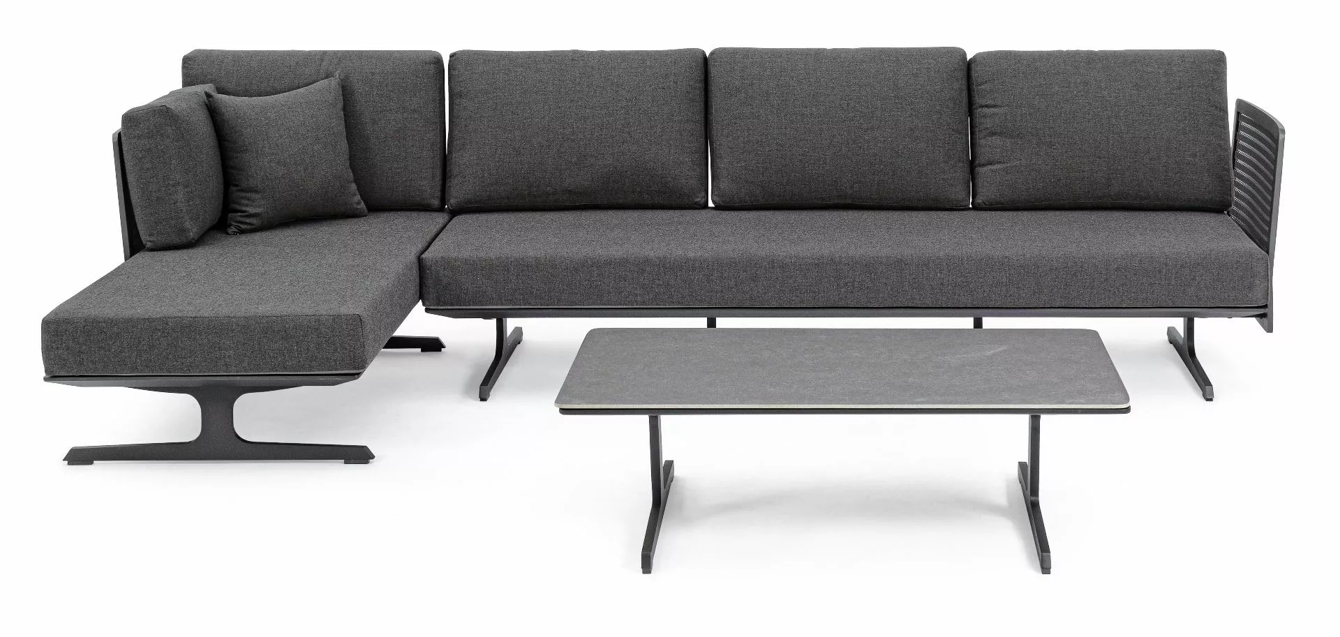 Pulverlakkert (polyester) aluminium. sete- og ryggputer med avtakbart trekk i akrylstoff. salongbord med keramisk topp. skruer i rustfritt stål. rygglener som skal monteres.