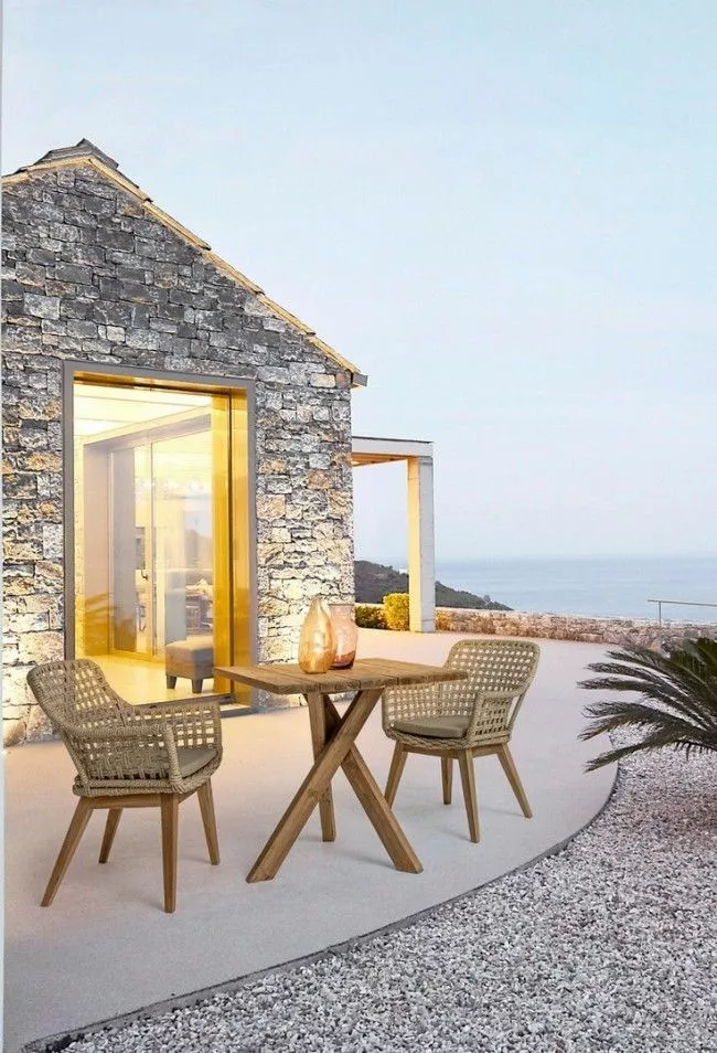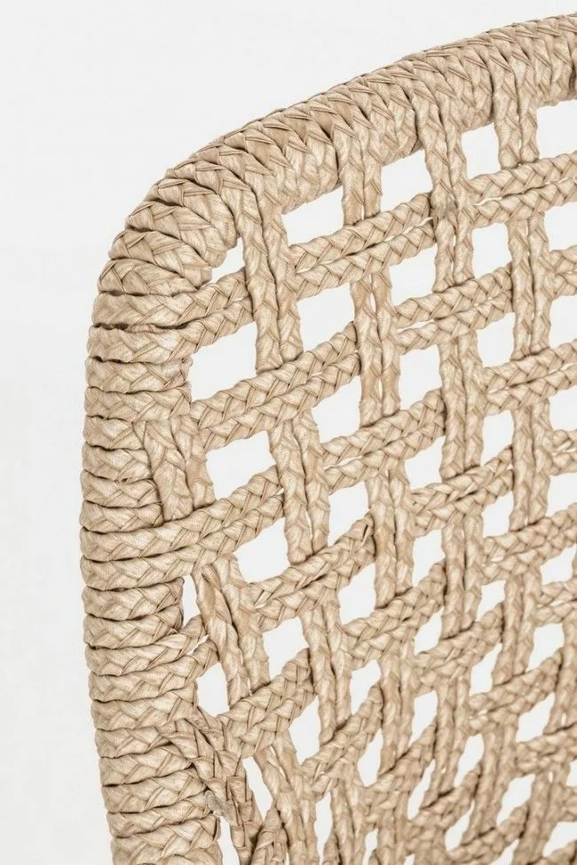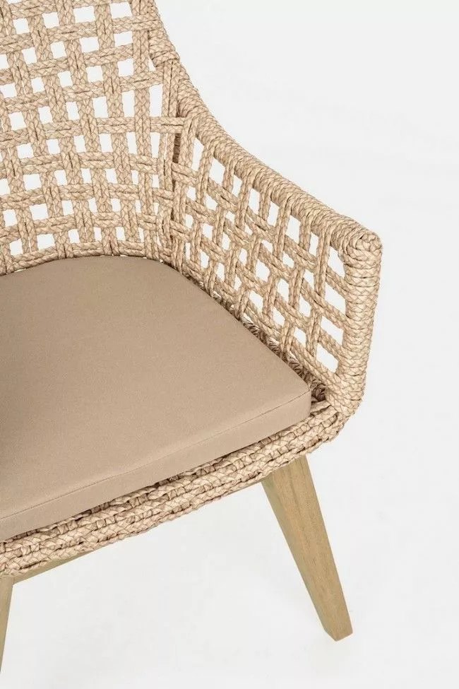 Sete med aluminiumsramme, pulverlakkert (polyester). viro syntetisk fiber veving med en original flettebøyning (skinneffekt). setepute med avtakbart trekk i soltett olefinstoff (100% polypropylen). ben i teak – svlk (indonesisk legal wood). galvaniserte stålskruer. ben som skal monteres.