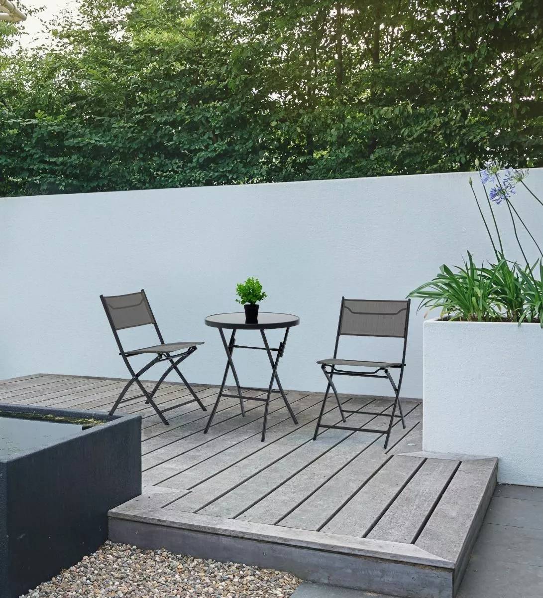 Stålramme, behandlet for utendørs gjennom sandblåsing og epoksy pulverlakk. topp i herdet glass (5mm). folding.
