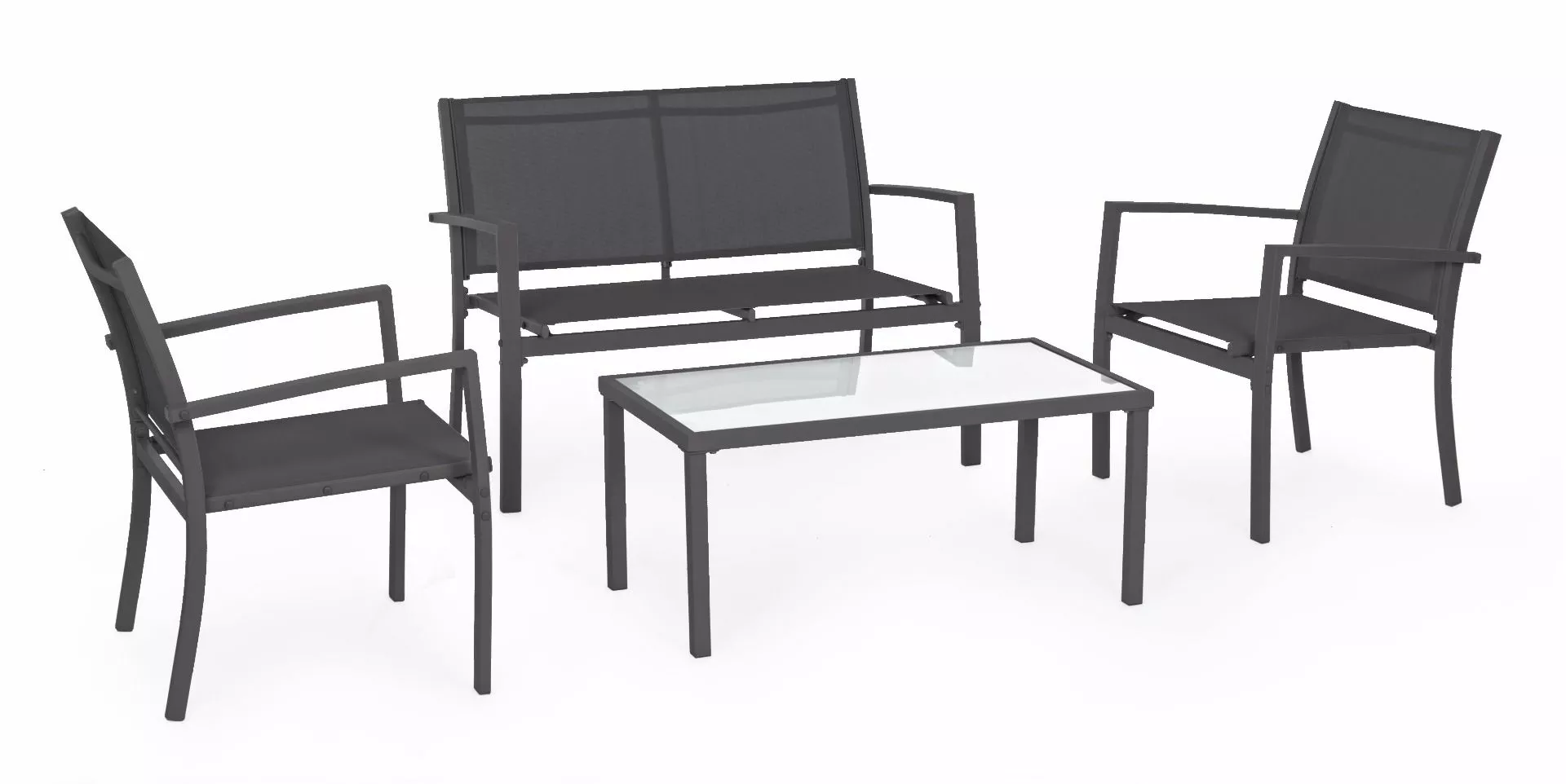 Stålramme (utendørs behandling gjennom fosfatering) pulverlakk (polyester), sete og rygg i tekstil 2×1. galvaniserte stålskruer. skal monteres.