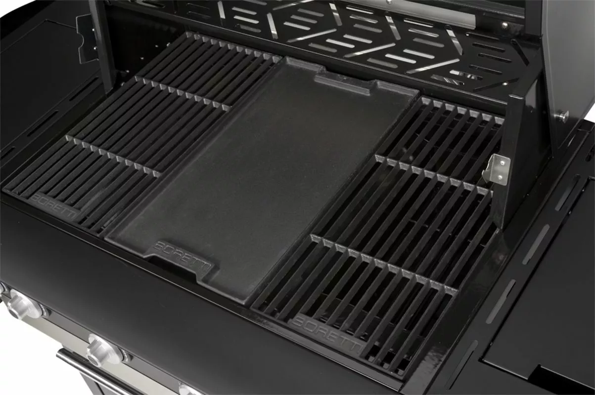 Upplev lyxen att kunna kombinera två olika grillar i ett. Med Ilbrido från Boretti väljer du om du vill grilla med kol eller gas, du får alltid perfekta resultat. På båda sidor har du rejäla sidobord som är perfekta när du vill ställa undan dina bestick, fat eller marinader. I locket finns en inbyggd termometer som gör att du alltid har kontroll på värmen.