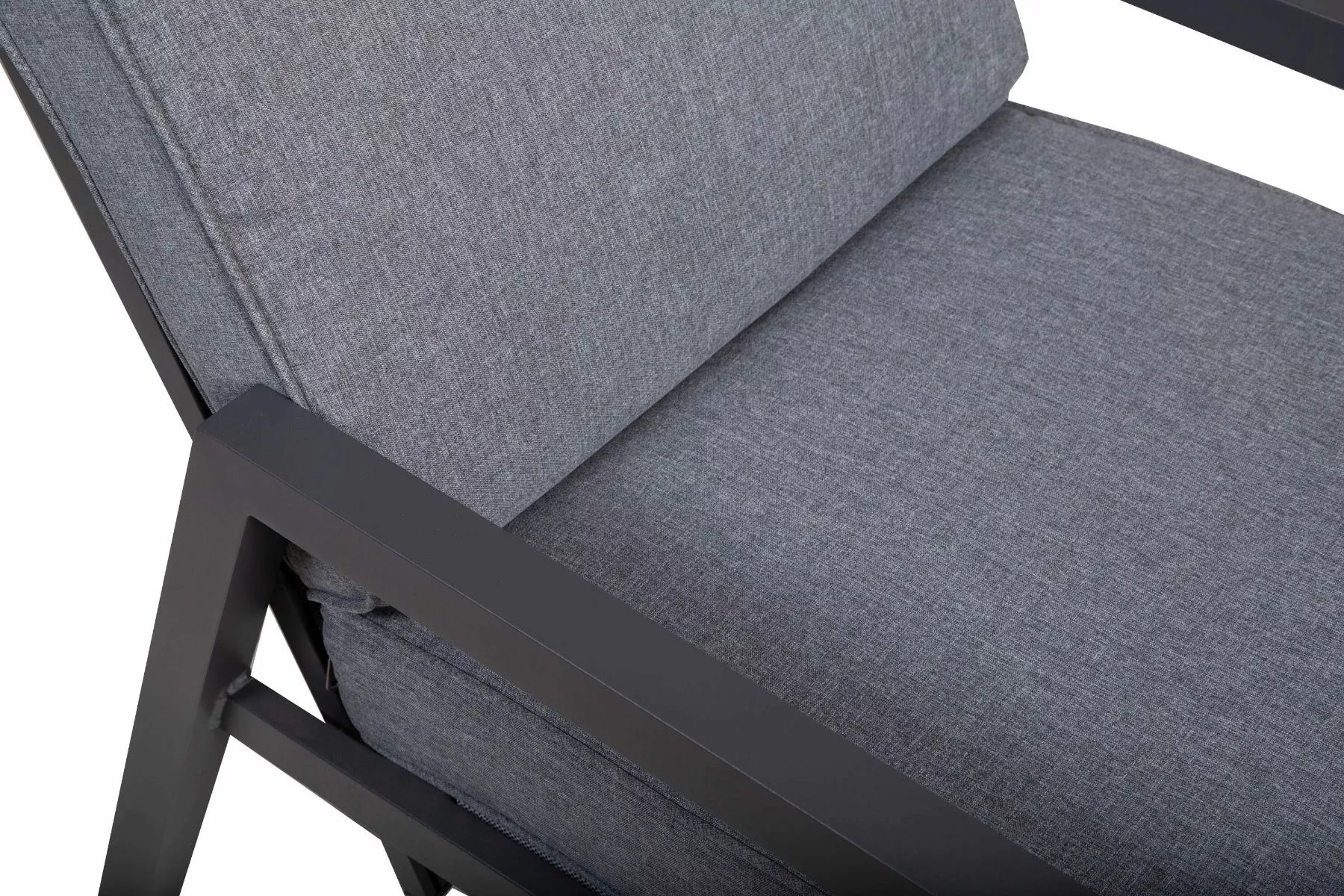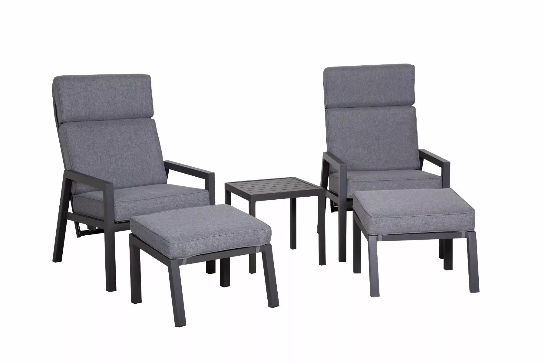 Aluminium reclinersett 5pcs med 2x recliner stol, 2x ottoman og 1x bord. Pulverlakkert aluminium ramme med textilene i sete og rygg. Polyester puter.