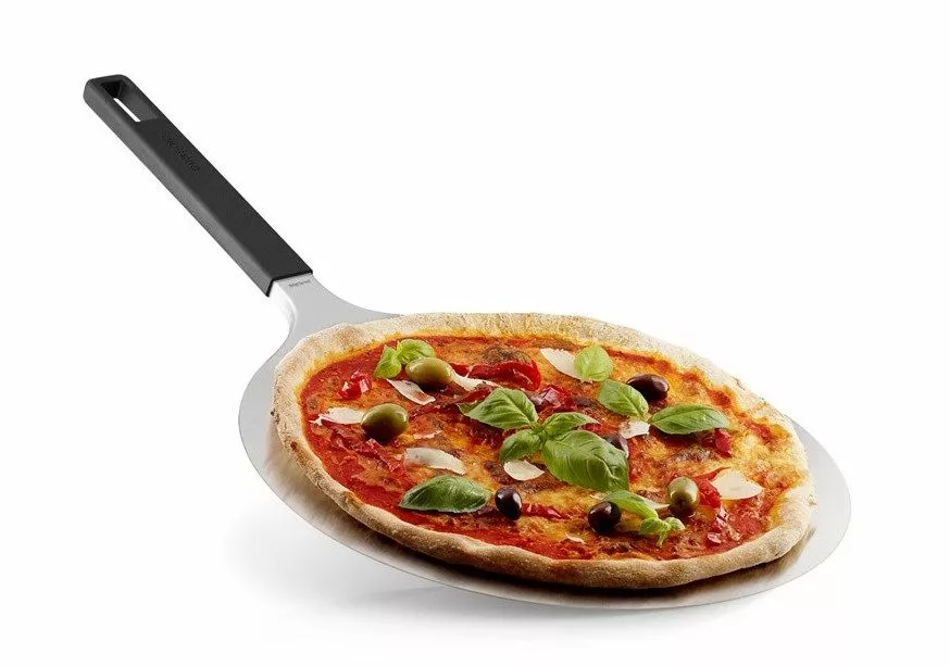 Pizzaspaden er i rustfritt stål, noe som gjør at den er lett å skyve inn under pizzaen, og håndtaket i silikon har en perfekt lengde og blir ikke varmt under bruk. Hullet i håndtaket gjør at pizzaspaden kan henge ved siden av grillen slik at den er lett tilgjengelig når du trenger den.