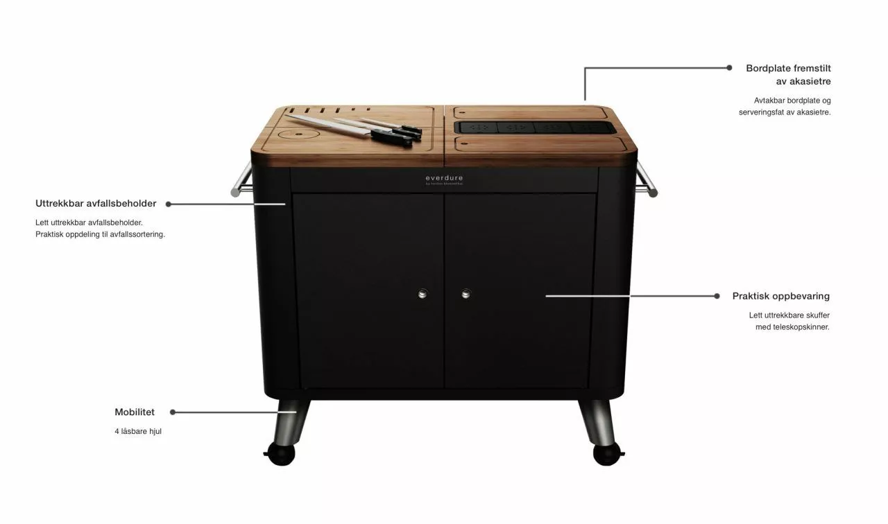 Utekjøkkenet er utstyrt med forskjellige adskilte rom som gjør det mulig for deg å ha matvarene samlet og organisert – uten å måtte forlate grillen under tilberedningen.