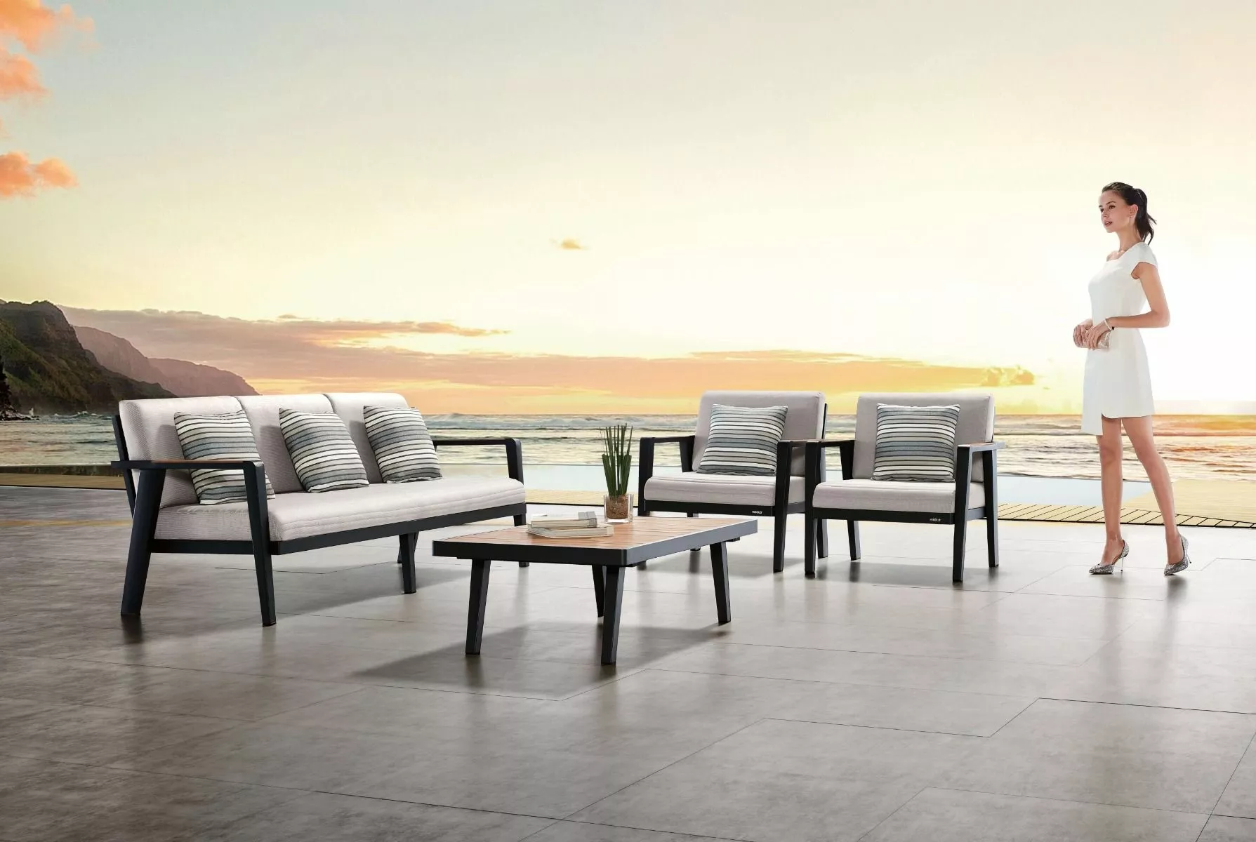 Emoti Lounge settet består av en komfortabel 3-seters sofa, to luksuriøse lounge stoler og et elegant salongbord. Denne moderne hagegruppen fra Higold er designet i nordisk stil og er perfekt for å skape en koselig og stilfull uteplass. Stolene og sofaen er romslige og gir en behagelig sittekomfort. Higold benytter kun de beste råmaterialer for å sikre lang levetid på møblene.