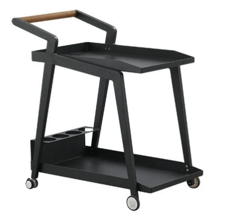 Emoti Serveringsvogn er en robust og elegant serveringsvogn med doble hyller og flaskeholder. Vognen er laget av pulverlakkert aluminium og har håndtak i teak, noe som gir et stilfullt og moderne utseende.