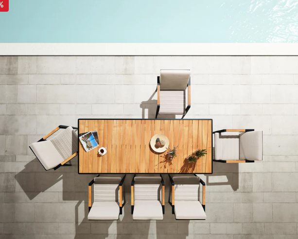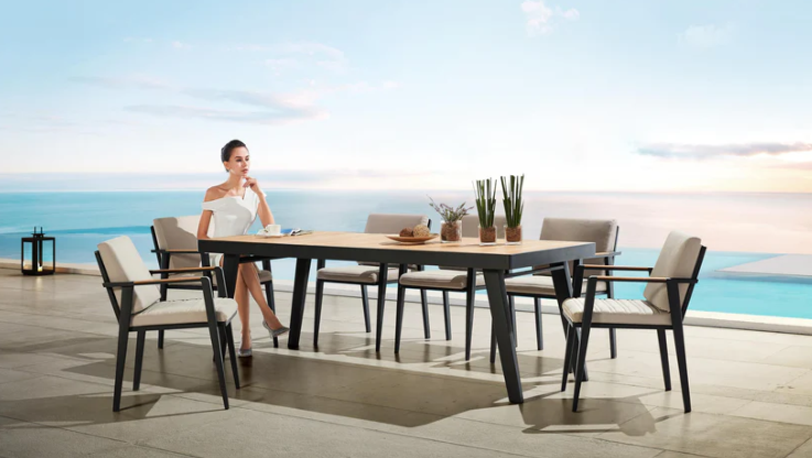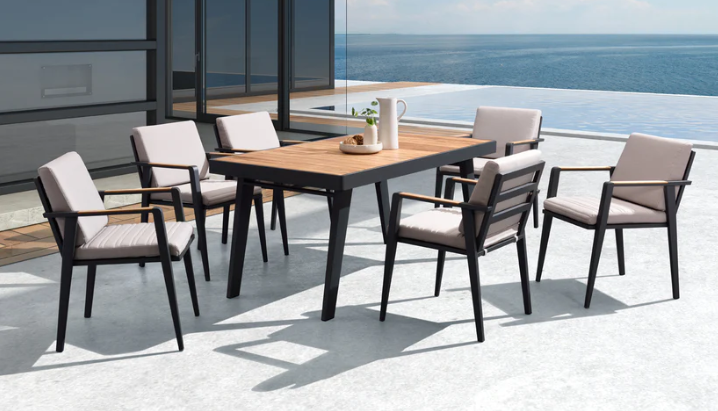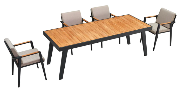 Bordets høyde og bein er utformet slik at alle får god benplass og opplever god plass rundt spisegruppen. Stolene og bordplaten har teak-detaljer av klasse A som er FSC-sertifisert for å sikre bærekraftig skogbruk.