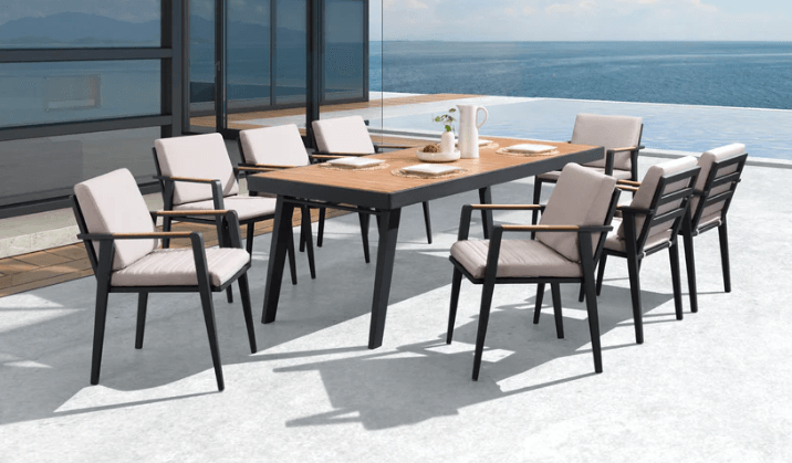 Bordets høyde og bein er justert slik at alle får god benplass og en behagelig opplevelse rundt spisegruppen. Stolene og bordplaten har detaljer i teak, som er av klasse A og FSC-sertifisert.