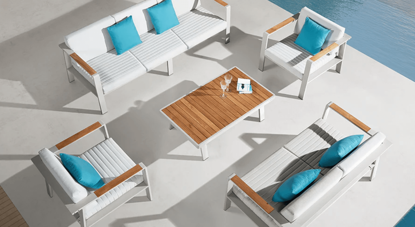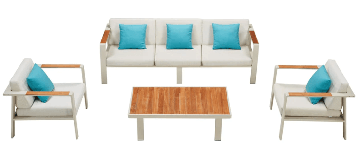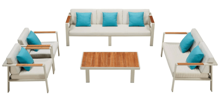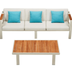 Nofi Hagegruppe 3+2 er en stilfull og moderne utemøbelserie fra Higold. Den inneholder en treseter sofa, to loungestoler og et salongbord. Møblene er spesielt konstruert for å tåle det tøffe nordiske klimaet med kraftig konstruksjon og slitesterke materialer. Stolene og sofaen er romslige og gir svært god sittekomfort. Konstruksjonen har en kraftig aluminiumsramme av høy kvalitet med Akzonobel-pulverlakk og FSC-sertifisert teak, som gir et smakfullt og trendy design. Nofi-serien har puter i Olefin-stoff som er svært værbestandig og kan vaskes i maskin på 30 grader. Det er angitt anvisninger på innsiden av putetrekket. De høykvalitets skummadrassene gir svært god sittekomfort og lang levetid. Møblene er også UV-bestandige, vannavstøtende og fargeekte.