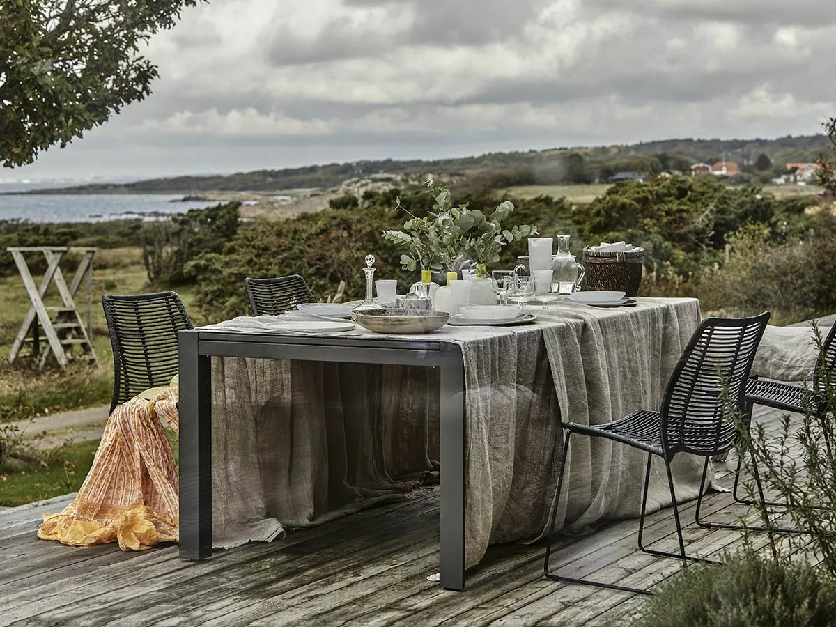 En praktiskt spisebord som måler 220 cm og kan enkelt forlenges til 340 cm med tilhørende uttrekkplate. Laget av aluminium. Farge: kullgrå. Bordplate av keramisk glass.