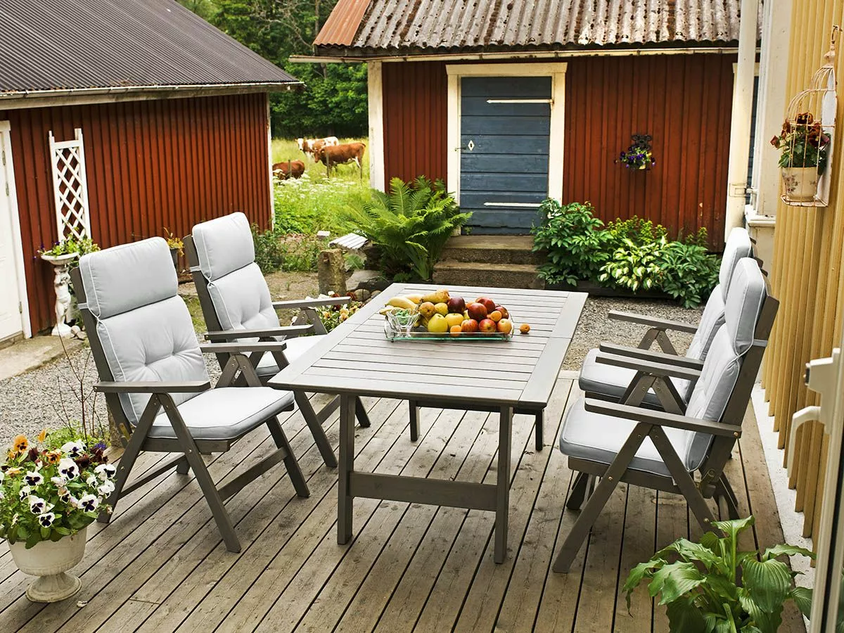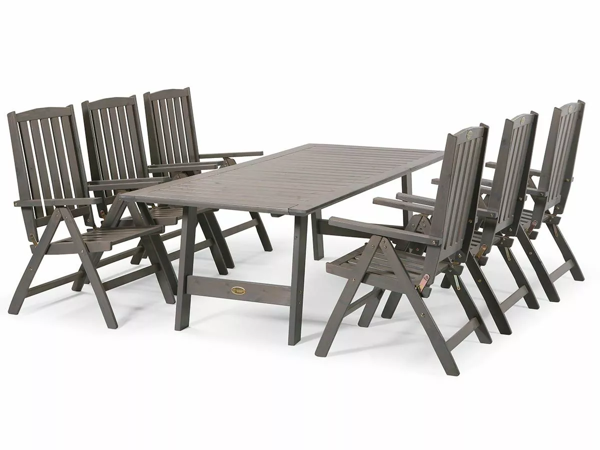 En klassisk spisegruppe i grålasert FSC®-sertifisert kjernefuru fra Norrland. Stolen er justerbar i forskjellige posisjoner og kan enkelt felles sammen for praktisk oppbevaring. Bordet er 165 cm langt og forlenges til 225 cm med den medfølgende ileggsplaten. Hvis du ønsker å forlenge bordet ytterligere, kan du kjøpe en ekstra ileggsplate.