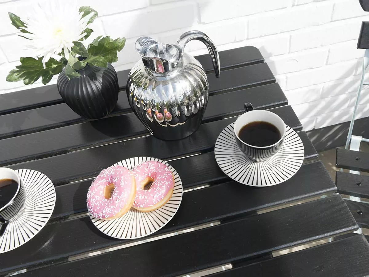 Cafebord med ramme av galvanisert stål, bordplate i svartlakkert tre. Kan foldes sammen for enklere oppbevaring.