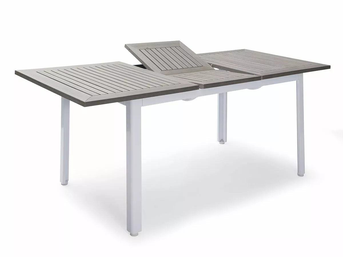 Bordet, som måler 90×150/200 cm, har en bordplate av grå Gaumo™ og kan utvides til 200 cm. Benene er laget av aluminium.