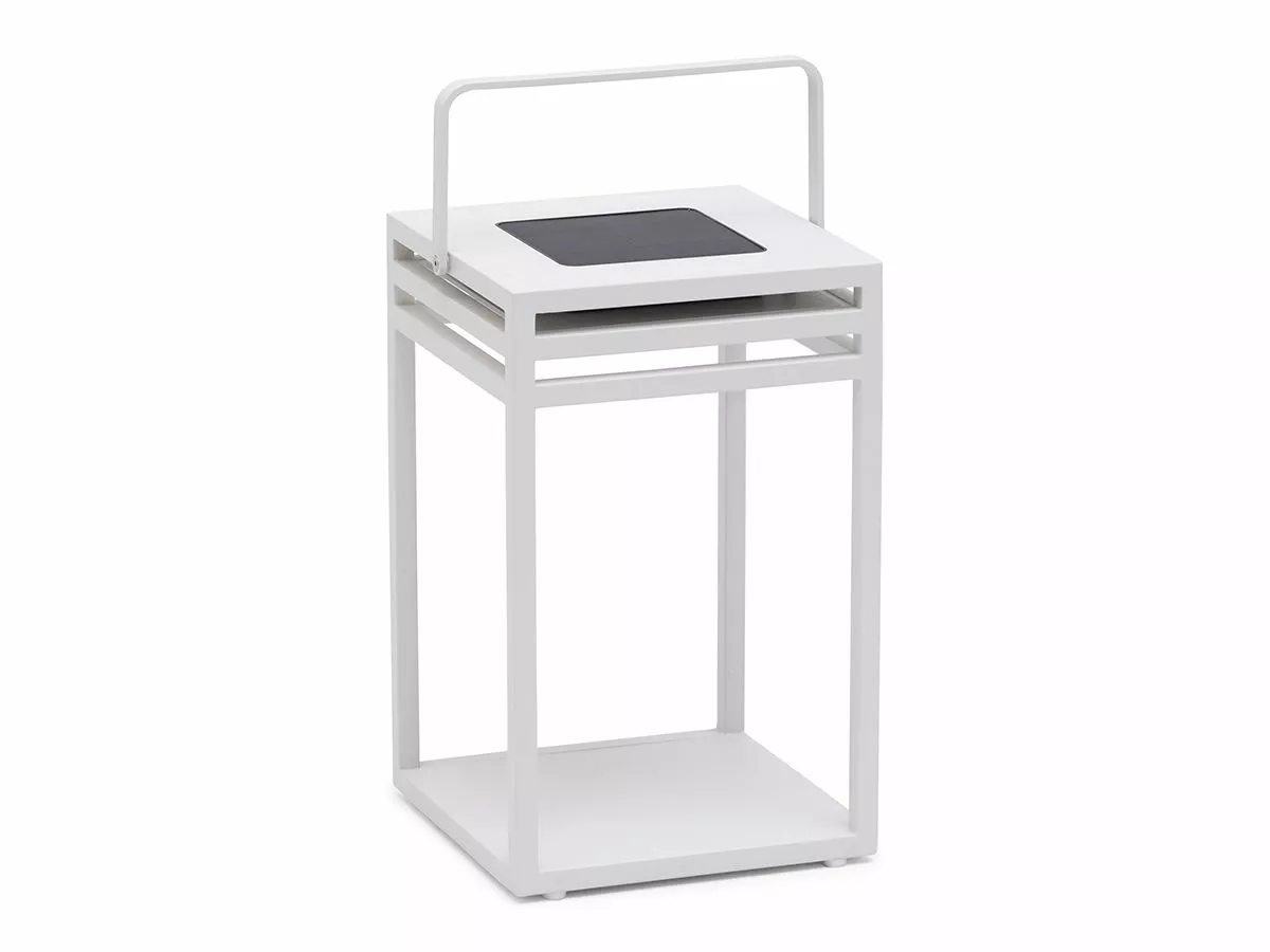 Stilig og miljøvennlig belysning med LED-lampe og solceller i skandinavisk design. Lykten lades opp via solcelle eller USB. Kan justeres til 30, 50 eller 100% lysstyrke. Laget av hvit aluminium.