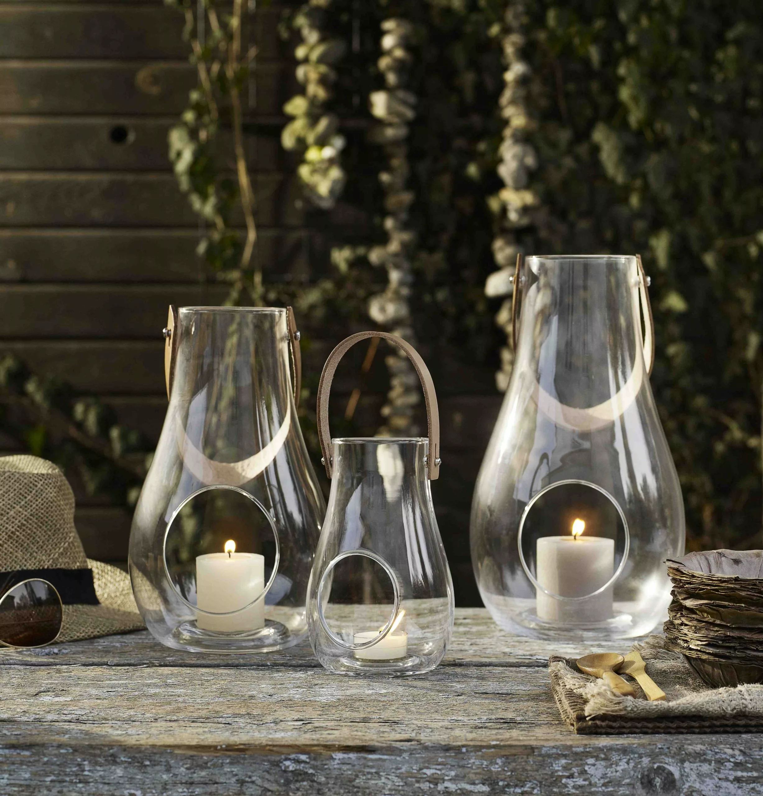 Använd designen med ljuslykta året runt. För sommarkvällar på terrassen, för dekoration på golv, bord, trappor och fönster – och som en snygg juldekoration med ett par kottar, gran och kanelstänger i botten. Maria Berntsen har skapat den mobila ljuskällan i glas och kärnläder för att sprida mysighet i skandinavisk stil. Denna lykta är 29 cm hög, men den finns också i en liten version på 16 cm, en mellanversion på 24,8 cm och en golvversion på 45 cm. Lyktorna finns i både klart och frostat glas och är trevliga att kombinera. En bra presentidé för ett speciellt tillfälle.