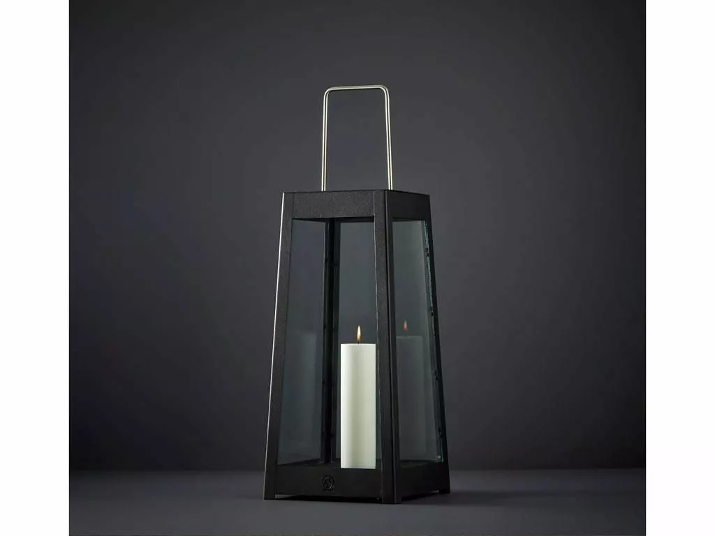 Lanternen åbnes med låget i toppen, hvilket giver den det flotte og helt enkle look, og desuden undgås klaprende sidelåger. Lanternen er meget robust i kraftigt jern og med en glastykkelse på 3,5 mm, og fødderne kan justeres, så den står plant og stabilt og samtidig hæves lidt fra underlaget. Der er vanddræn i bunden, og den sorte pulverlakering er velegnet til al slags vejr.