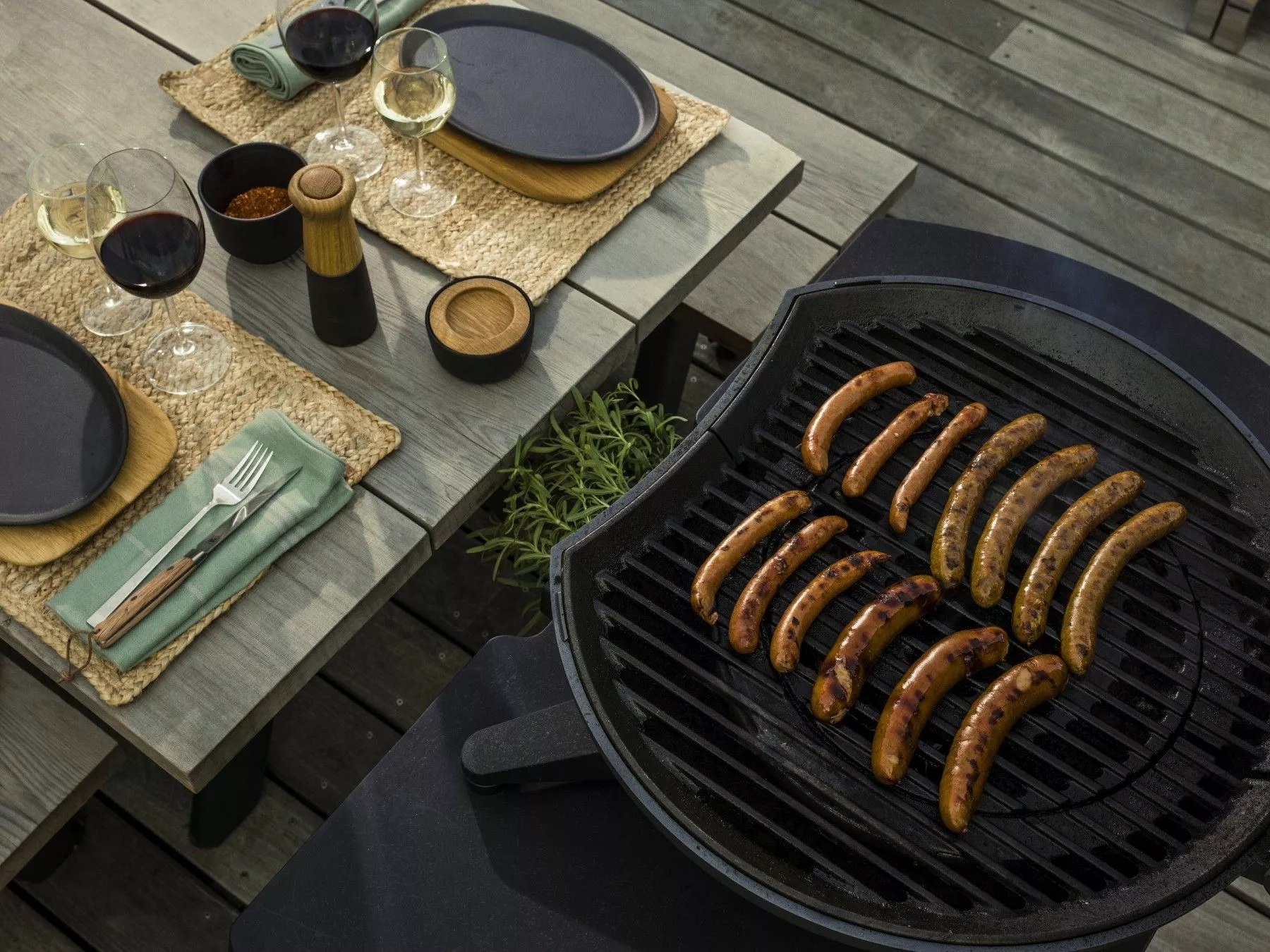 Det minimalistiska greppet kompletterar framsidan av formen, både vad gäller design och ergonomi. Samtidigt ger det fyrbenta chassit grillen en stabil grund som helt naturligt och diskret bildar utrymme för både manöverpanelen och gasanslutningen.