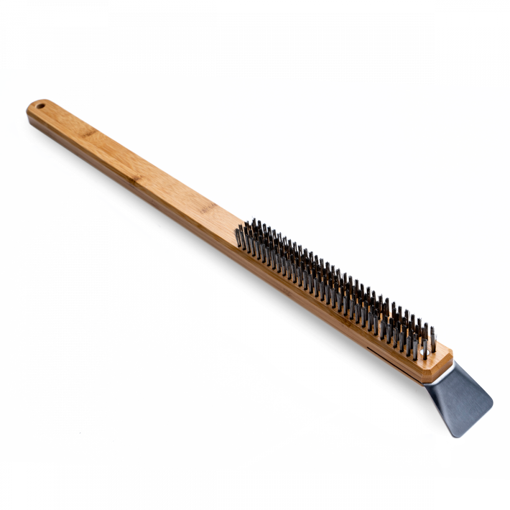 Bekvämt för rengöring av spisen om något spills och brinner in i stenen. Byst och skrapa i stål. Bambuhandtag.
