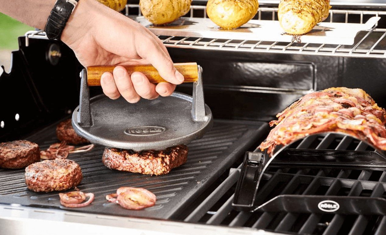 Grillpress i gjutjärn med handtag i valnöt. Grillpressen värms på grillen, sedan lägger du i maten som ska tillagas. Passar mycket bra för att grilla hamburgare, men även olika kött som bara ska tillagas en kort stund.