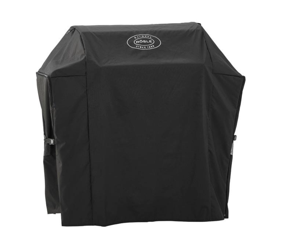En praktisk funktion för Rösle Videro G4-S gasolgrill. Överdraget är lätt och skyddar grillen väl från regn, UV-strålning och pollen. Kåpan är justerbar, beroende på om du vill dra den över grillen med sidoborden utfällda eller inte.
