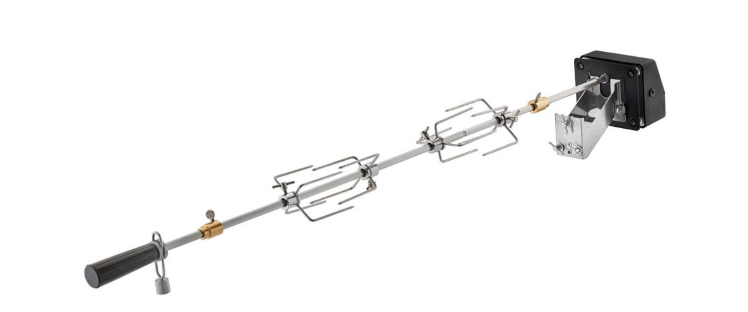 Rotisserie som är perfekt för att tillaga kyckling, gyros och liknande för att uppnå perfekt jämn tillagning. Roterar cirka tre gånger på minuter. Köttet blir otroligt saftigt på insidan och krispigt på utsidan. Denna passar till Videro G4 och G6 gasolgrill.