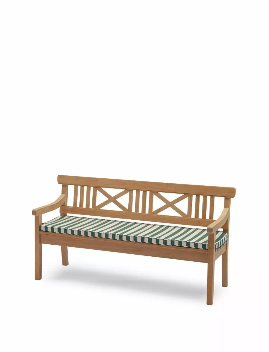 For å feire Drachmann-benkens 40-årsjubileum har vi oppgradert putene med fargerike striper for å gi den klassiske benken et nytt uttrykk. Drachmann-puter er skreddersydde for å passe til kolleksjonen og svært værbestandige. Møbelstoffene er Oeko-Tex-sertifisert, farge- og lysbestandig, vann- og smussavvisende og til og med muggbestandig. Puten tørker eksepsjonelt raskt, selv etter et kraftig regnskyll, da skummet har en åpencellet struktur som lar vann og luft passere. Skummet gir en fast og behagelig tekstur som forblir den samme år etter år.