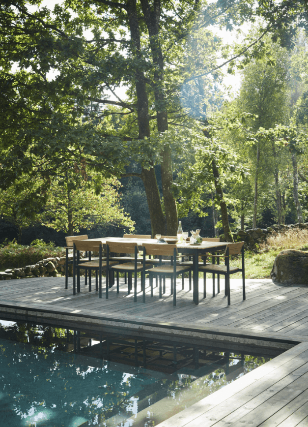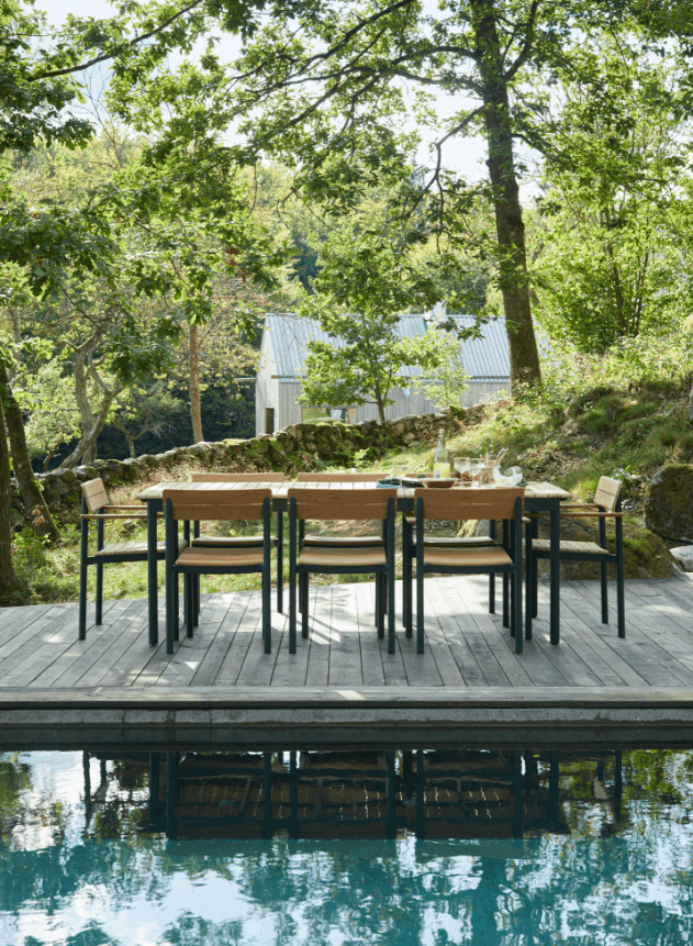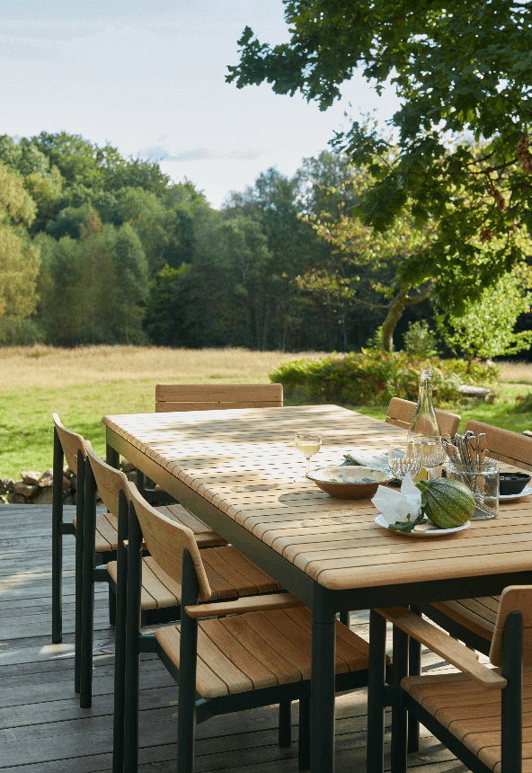 Ettersom treverket er ubehandlet, vil overflaten patinere over tid og etter hvert bli vakkert sølvgrå. Hvis du ønsker å bevare eller intensivere den originale honninggyldne fargen, bruk en passende møbelolje med jevne mellomrom. Treverket er motstandsdyktig mot hverdagsvind og vær med eller uten behandling på grunn av det høye innholdet av naturlige oljer.