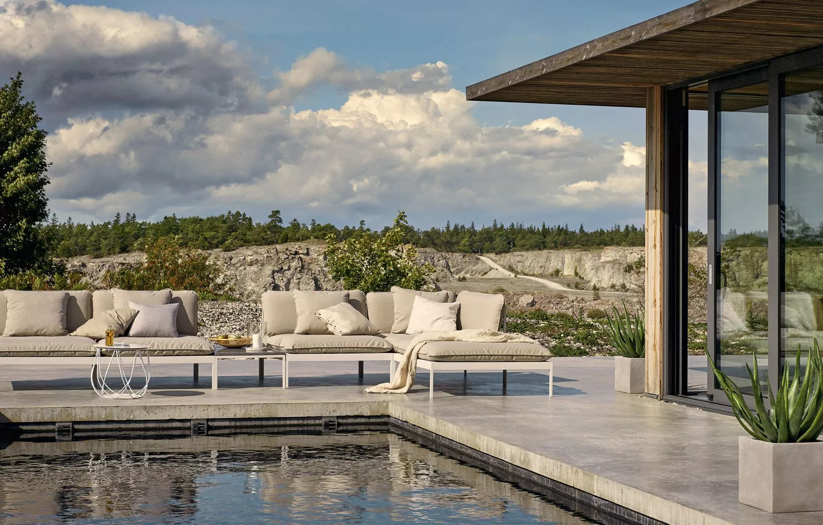 Ett smart modulärt soffsystem som kan användas året runt utomhus. Mycket mångsidig, mycket slitstark. Ramarna är gjorda av aluminium, kuddarna är gjorda av Sunbrella utomhustyger och fyllda med Quickdry-skum.